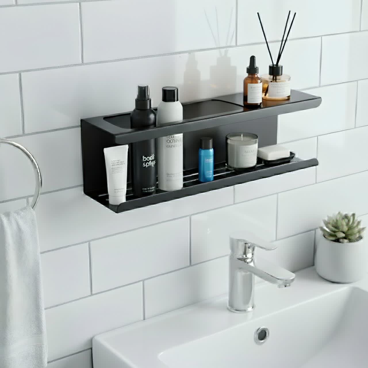 بهینه‌سازی فضای حمام: با استفاده از طبقه روی دیوار، می‌توان شامپو، صابون، لیف، اسفنج و سایر وسایل حمام را به خوبی مرتب کرد.
